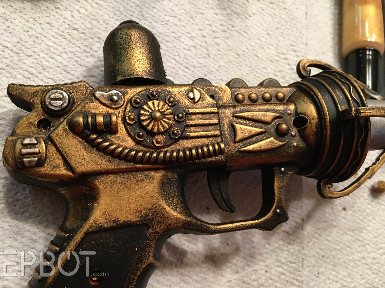 Start by covering the whole gun in a rough coat of gold wax. A small stiff paint brush works great for all those nooks and crannies.
