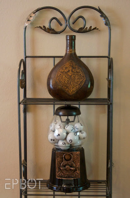The bottle is actually glass covered with leather, and was a $2 antique flea market find. I've had the gumball machine since college. This is its 3rd paint job: bronze and aged copper. The porcelain balls inside it are from TJ Maxx - although since everyone who sees them says, "Look! Lotto balls!" I now wish I'd purchased the alphabet ones instead of the numbers. Hah!